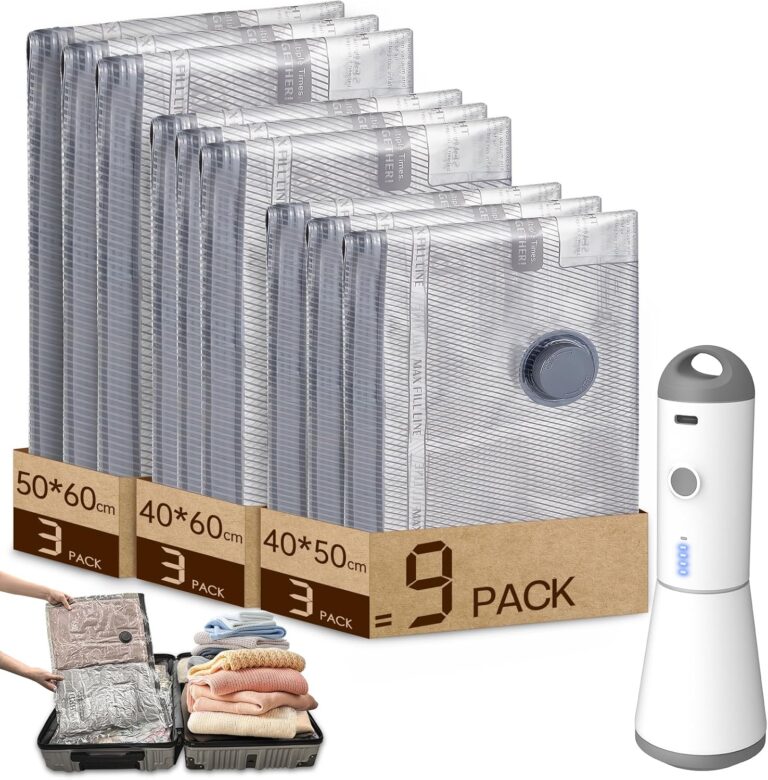Scopri Sacchetti Sottovuoto Vestiti con Pompa Sottovuoto Senza Fili, 9 Pezzi: Riduci fino al minimo l’ingombro e proteggi i tuoi capi con una compressione rapida e senza sforzo ovunque ti trovi